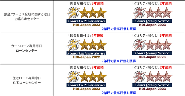 「問合せ格付け」については、カードローン専門窓口である「ローンセンター」が今回の受賞で4年連続、預金/サービス全般に関する窓口である「お客さまセンター」と、住宅ローン専門窓口である「住宅ローンセンター」が3年連続で三つ星を獲得しました。