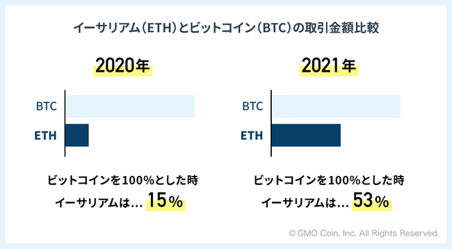 2020年の対ビットコイン比率は15%でしたが、2021年は53%となり、イーサリアム(ETH)の取引金額がビットコインの半分以上となりました。