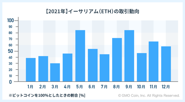 2021年における対ビットコイン比率の月別は3月の30%が最も低く、5月と9月には85%となりました。いずれの月も2020年と比較して高くなり、イーサリアム(ETH)の勢いを伺わせる結果となりました。