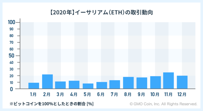 2020年における対ビットコイン比率の月別では5月の8%が最も低く、11月の25%が最も高いという結果になりました。