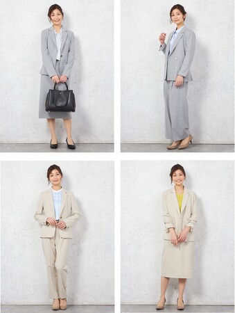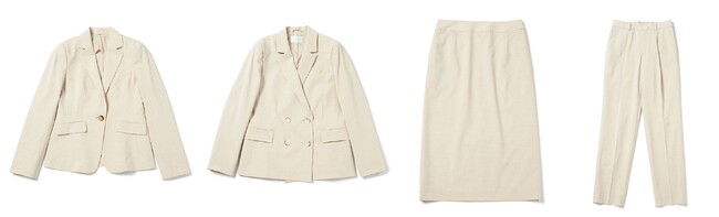 春夏シーズンに合わせた爽やかなライトグレーとベージュのカラーのセットアップをご用意いたしました。 『デレガント セットアップ』は、共生地のジャケット2型、ボトム2型のアイテム展開となっております。ベーシックなテーラードジャケット、こなれ感を演出するダブルジャケット、長めの丈感で上品な印象のタイトスカート、グレーはトレンドのタック入りワイドパンツ、ベージュはすっきり見えするタック入りテーパードパンツをご用意しており、お好みに合わせてスタイリングをお楽しみいただけます。