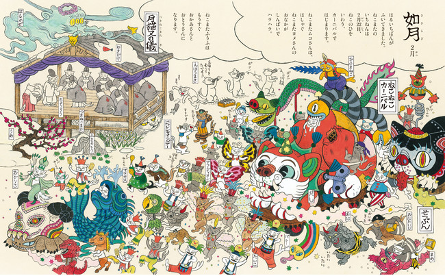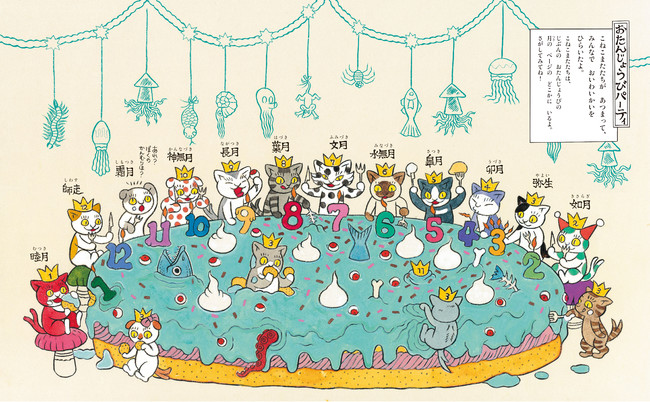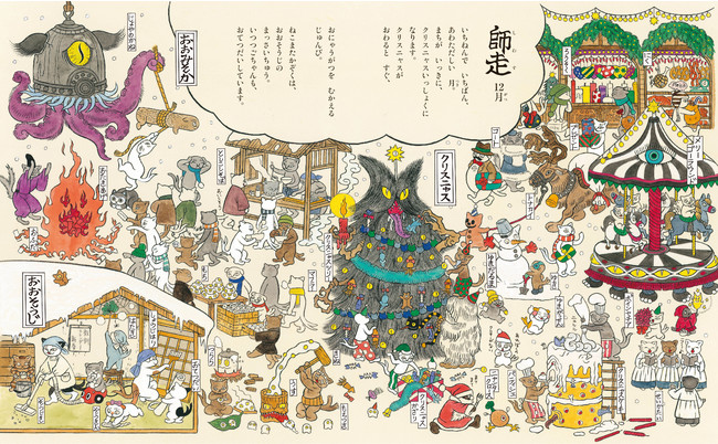 2月22日「ねこの日」は盛大なパレードでお祝いし、弥生にはおひにゃさまの座をきそう「ひにゃまつり」。霜月には「またたびまつり」を楽しんで、師走には目玉チキンで「クリスニャス」! ねこまたたちの奇妙で愉快な1年間を、1か月1見開きの緻密な絵で紹介する行事絵本。