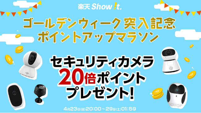 楽天市場「Show !t」は、4月23日(日)20時~4月29日(土)01時59分まで開催される楽天お買い物マラソンに参加し、セキュリティカメラ5種類を対象として、ご購入の方にポイント20倍プレゼントを実施します。壁掛け対応、専用スタンドでどこでも気軽に設置可能な配線不要のフクロウ型セキュリティカメラは、双方向通話可能で子供部屋の見守りに、外出中のペットの見守りにも便利です。また、複数の部屋に設置するための、まとめ買いにもおすすめです。