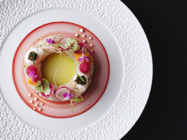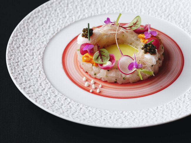 リースを型取ったカンパチのタルタルを、キャビアオシェトラやウニ、地元野菜など、季節の味覚で飾り付けた華やかな一皿。ビーツのソースでクリスマスカラーに仕上げました。