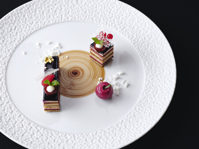 カシスの酸味がきいた大人のガトーオペ ラ。ガナッシュとコーヒーバタークリームの、風味豊かなデセールをお楽しみください。