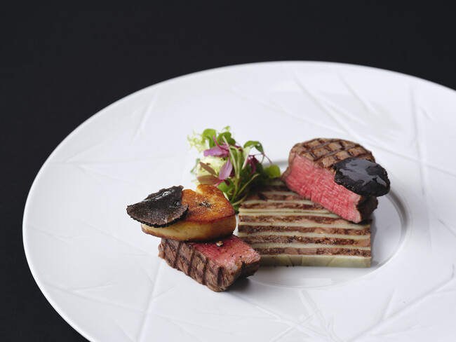 国産牛フィレ肉とフォアグラのローストを、赤ワインソースでお召し上がりいただ く一品。煮込んだ牛テール肉とポテトのミルフイユを添えてご提供いたします。