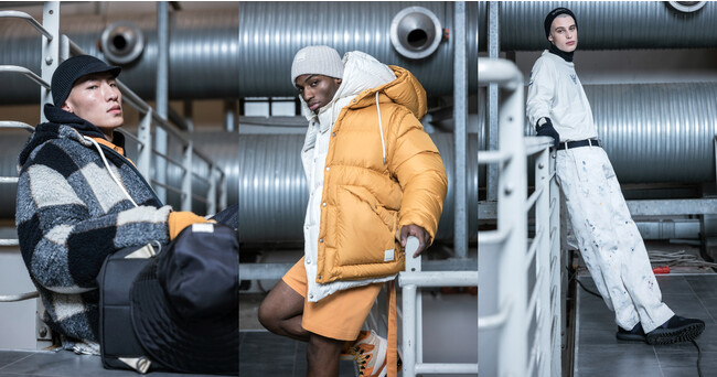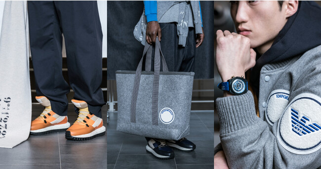 また、テクニカルソールのスニーカーや、キャップ、ニット帽、マフラー、靴下、ベルトセット、トートバッグなどのアクセサリーも充実しており、サングラス、時計は、原産地証明付きバイオベース素材やリサイクル素材で製造されています。