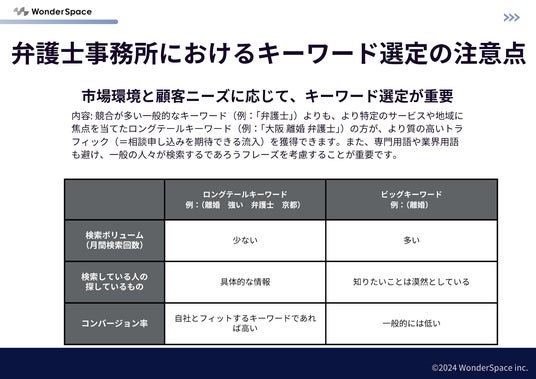 弁護士事務所におけるキーワード選定では、検索ボリュームの多いキーワードよりも、特定のサービスや地域に焦点を当てた検索ボリュームの少ないキーワードのほうがより問い合わせ見込みの高い顧客を獲得できます。