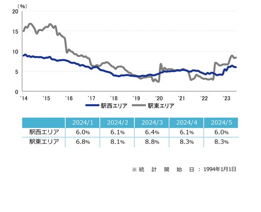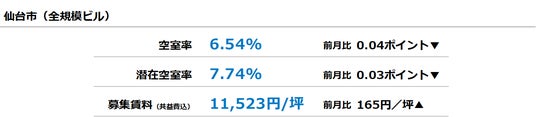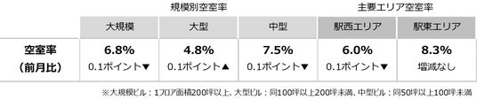空室率は前月比マイナス0.04ポイントの6.54%となり、2ヵ月連続で低下した。自社ビルへの集約移転や部分解約により空室が生じた一方、新築ビルを中心に空室消化が進んでいる。潜在空室率は前月比マイナス0.03ポイントの7.74%だった。