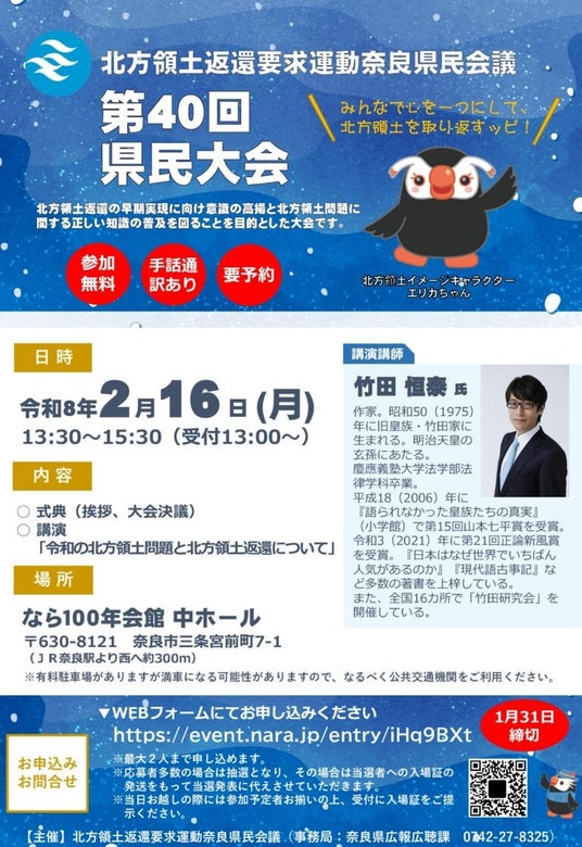 北方領土返還要求運動奈良県民会議では、北方領土返還の早期実現に向けて県民の意識を高めるため、令和8年2月16日(月)に第40回県民大会を開催します。申込は1月31日(土)まで。