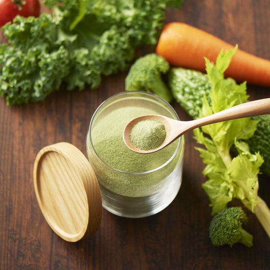 大豆たんぱく(国内製造)、難消化性デキストリン(食物繊維)、野菜粉末(ケール、大麦若葉、ブロッコリー、かぼちゃ、チンゲンサイ、パセリ、にんじん、セロリ、にがうり、ほうれんそう、桑の葉、モロヘイヤ、よもぎ、トマト)、有胞子性乳酸菌/pH調整剤、香料、ビタミンC、安定剤(グァーガム)、甘味料(ステビア)