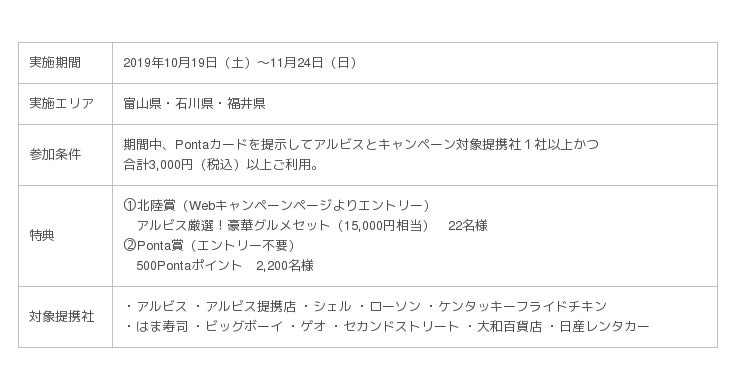 期間中、Pontaカードを提示してアルビスとキャンペーン対象提携社1社以上、かつ合計3,000円(税込)以上のご利用で、キャンペーンに参加できます。Webキャンペーンページよりエントリーすると、抽選で22名様に当たる、アルビス厳選の豪華グルメセットの「北陸賞」に応募できます。また、エントリー不要で500Pontaポイントの「Ponta賞」が抽選で2,200名様に当たります。