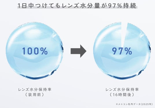 現代人の目はパソコンやスマートフォンの使用による酷使、空調による乾燥など、さまざまなストレスにさらされています。特にコンタクトレンズユーザーにとって、「乾燥」は大きな悩みの種。「乾燥」にお悩みのユーザーにももっと快適にコンタクトレンズを使用していただきたいとの想いから、ヒアルロン酸の約2倍の保湿力を持つMPCポリマー※2をレンズ表面に配合し、1日中つけていてもレンズ水分量が97%持続する、「うるおい」にこだわった1DAYコンタクトレンズをご用意いたしました。涙と親和した「水潤レンズ」をご体感ください。