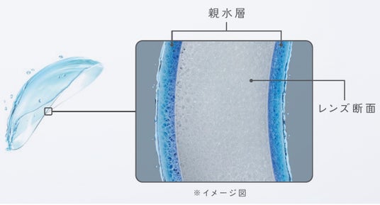 レンズ表面に保湿成分MPCポリマーを配合し親水層を形成。レンズの表面がみずみずしく、うるおいが長時間持続します。