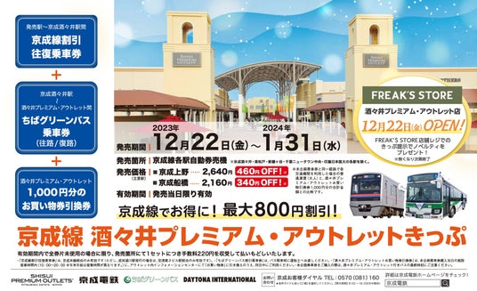 京成電鉄(本社:千葉県市川市、社長:小林 敏也)と、ちばグリーンバス(本社: 千葉県佐倉市、社長:渡邉 友樹)、「酒々井プレミアム・アウトレット」(千葉県印旛郡酒々井町)を運営する三菱地所・サイモン(本社:東京都千代田区、社長:山岸 正紀)では、お得な企画乗車券「京成線 酒々井プレミアム・アウトレットきっぷ」を2023年12月22日(金)~2024年1月31日(水)の期間で発売します。