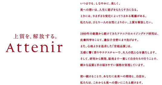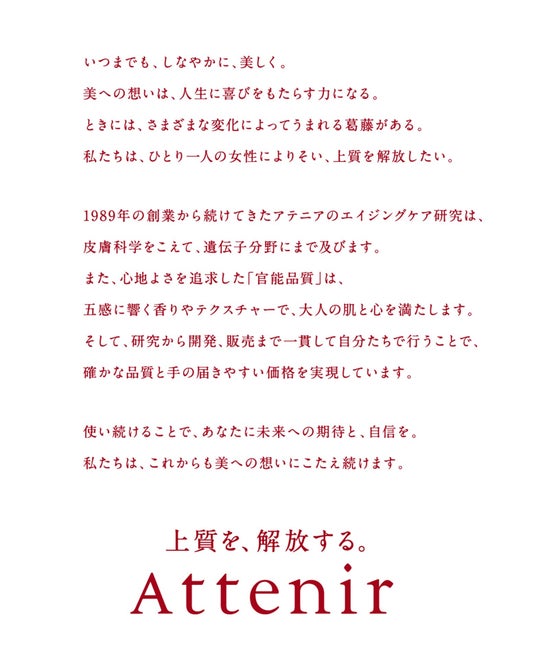 株式会社アテニアは、新たなタグラインとして「上質を、解放する。」を制定し、11 月19 日(水)から始まるTokyo Beauty Week を皮切りに、順次展開いたします。このメッセージには、「美しくありたい気持ちを阻むあらゆるものから、解き放たれた世界をつくる」というミッションのもと、創業の原点や未来への挑戦、そして大人女性の葛藤からの解放という3つの想いが込められています。今後、全ての事業活動の基準とし、一貫性のあるブランディングを推進して、“上質”な体験をより多くのお客様に提供し、大人女性の“葛藤からの解放”を目指します。