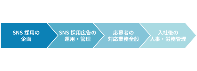 「SNS採用おまかせパッケージ」では、「SNS採用をはじめたいけど、やり方がわからない」、「リソースが足りない」等の課題をかかえる企業の皆さまを企画段階からサポート。SNS採用広告の運用・管理、応募者の対応業務全般、入社後の人事労務管理まで、ソーシャルリクルーティングにかかる業務全般をご提案~実作業まで全て対応します。