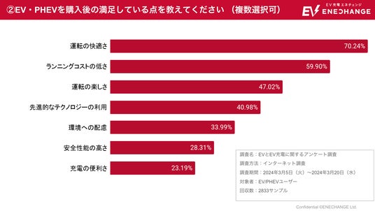 「現在所有しているEV・PHEVにどのくらい満足していますか?」という質問に対し、「非常に満足している(45.7%)」や「やや満足している(44.2%)」と回答し、全体の約9割が満足しているという結果となりました。満足している理由の上位は、「運転の快適さ(70.24%)」「ランニングコストの低さ(59.90%)」「運転の楽しさ(47.02%)」となり、EV購入後はEV自体の乗り心地に魅力を感じる人が多いことがわかりました。
