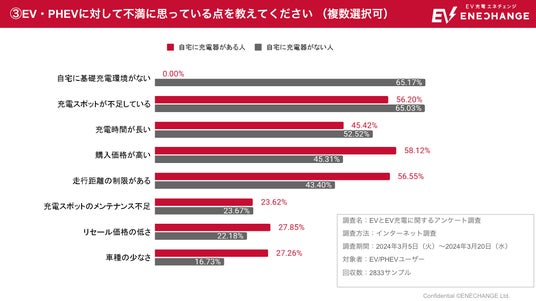 自宅に充電器がある人の上位の回答は「購入価格が高い(58.12%)」「走行距離の制限がある(56.55%)」「充電スポットが不足している(56.20%)」となり、EV・PHEVの機能や性能、充電スポットの不足が上位を占めました。それに対し、自宅に基礎充電がない人は「自宅に基礎充電環境がない(65.17%)」「充電スポットが不足している(65.03%)」、「充電時間が長い(52.52%)」となり、上位3回答全てが充電環境に関する不満となりました。