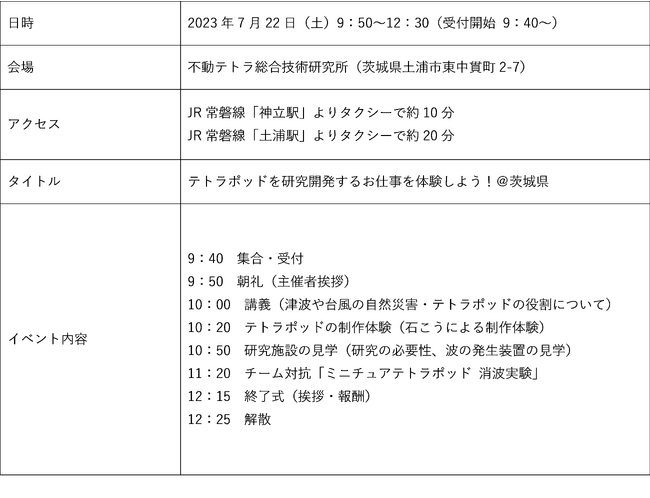 「次世代に海を引き継ぐ」をテーマに、アクトインディ株式会社が企画・監修のもと、一般社団法人地域みらい創造センターおよび、港湾土木事業のスペシャリスト株式会社不動テトラと共に、昨年開催時に好評を博した「キッズ研究員となって、テトラポッドを研究開発するお仕事を体験しよう!@茨城県」を7月22日(土)に開催いたします。