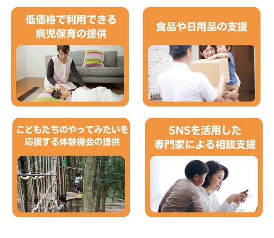 従来の訪問型病児保育事業「寄付によるひとり親支援プラン」に加え、新たに「食品支援」「相談支援」「体験提供」も対象となります。