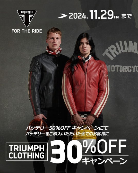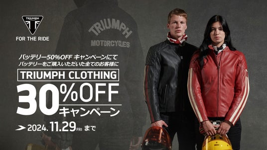 10月5日~11月29日までの同期間中、バッテリー50%OFF キャンペーンにてバッテリーをご購入いただいた全てのお客様を対象に、トライアンフのクロージングを通常希望小売価格から30%OFFでご購入いただけます。