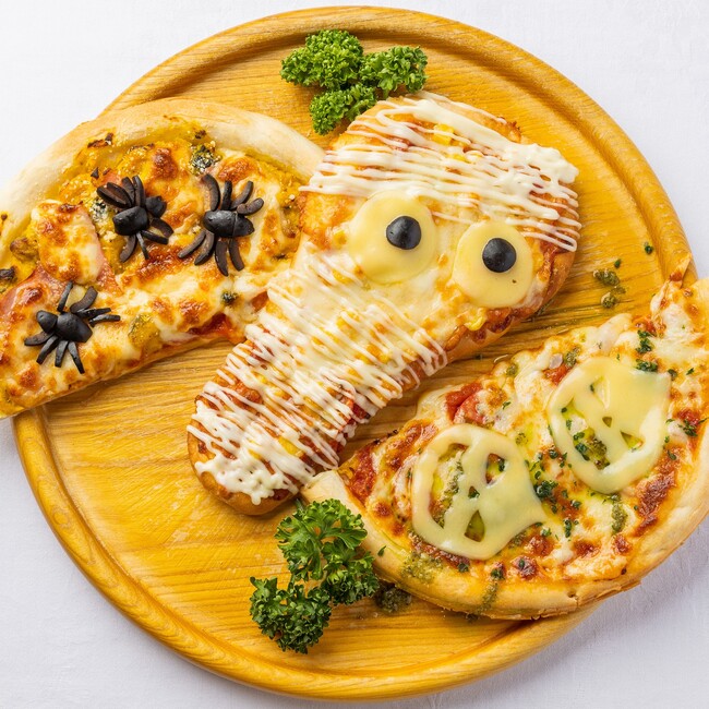 (“ミイラ”“スパイダー”“おばけ”に模した3種のミニピザをお楽しみいただけるメニューです。)