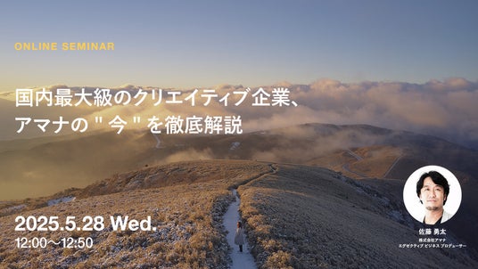 コミュニケーション変革をクリエイティブで実現する株式会社アマナ(本社:東京都品川区、代表取締役社長:金子剛章、以下「アマナ」)は、2025年5月28日(水)、「国内最大級のクリエイティブ企業、アマナの"今"を徹底解説」をテーマにオンラインセミナーを開催します。