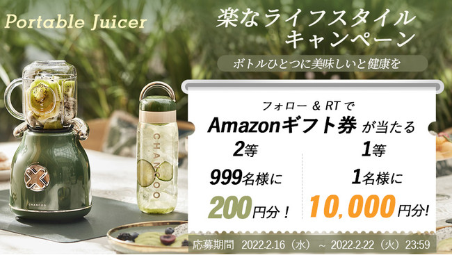Amazonで販売中のSOLEMOODポータブルジューサー「CC5800」について、2022年2月16日12:00よりAFUストアのTwitter公式アカウントで、Amazonギフト券1万円分が1名様、200円分が999名様に抽選で当たる楽なライフスタイルキャンペーンを開催しました。