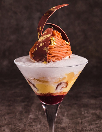 パフェの下の層には、渋皮栗を使ったまろやかな味わいのビスキュイと甘酸っぱいカシスソースを忍ばせることで、異なる食感を演出。さらに、芳醇な香りが楽しめるラムレーズンのアイスクリームとカスタードクリームを重ね、ラム酒が香る泡を華やかにデコレーションし、大人の味わいに仕上げました。トップには、なめらかな食感と、フランス栗の濃厚な味わいのモンブランをしぼり、金粉を振りかけたチョコレートを飾り付け、フォトジェニックなパフェに仕上げました。栗の豊かな香りと、爽やかの洋梨ジュレが織り成すリッチなハーモニーをお楽しみいただけ、口に入れた瞬間に穏やかな甘さが広がって、ホクホク感と心地良い余韻を味わえる逸品です。