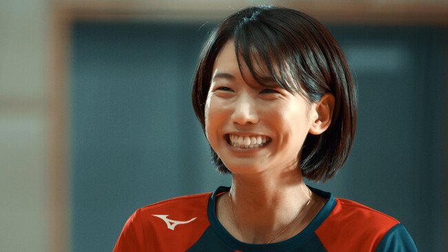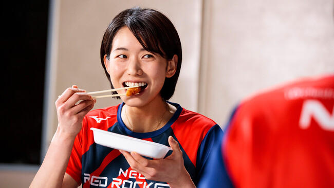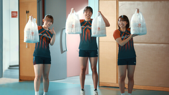 CM本編では、古賀選手がチームメイトと一緒に練習している様子と、差し入れの『チキン南蛮弁当』を食べる様子が描かれています。バレーボールに取り組む真剣な表情と、差し入れの瞬間に思わず笑顔がこぼれてしまう古賀選手の表情の変化にご注目ください。