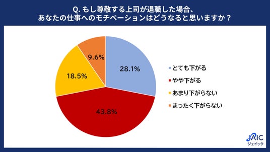 「もし尊敬する上司が退職した場合、あなたの仕事へのモチベーションはどうなると思いますか?」と質問したところ、「とても下がる」が28.1%、「やや下がる」が43.8%、「あまり下がらない」が18.5%、「まったく下がらない」が9.6%となりました。