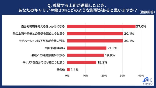 「尊敬する上司が退職したとき、あなたのキャリアや働き方にどのような影響があると思いますか?あてはまるものをすべて選択してください。」と質問したところ、「自分も転職を考えるきっかけになる」が37.0%、「他の上司や同僚との関係を深めようと思う」「モチベーションは下がるが会社に残る」がそれぞれ30.1%、「特に影響はない」が21.2%、「会社への帰属意識が下がる」が19.9%、「キャリアを自分で切り拓こうと思う」が15.8%、「その他」が1.4%となりました。