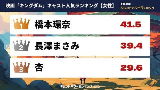 女性タレントでは、山の民の末裔・河了貂(かりょうてん)を演じ、2016年公開の映画「セーラー服と機関銃 -卒業-」で日本アカデミー賞新人俳優賞を受賞、2024年秋スタートのNHK連続テレビ小説「おむすび」で主演を務める女優が1位にランクイン。