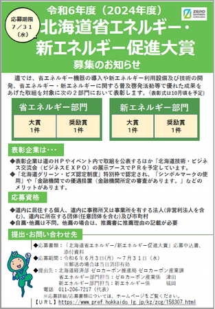 道では「北海道省エネルギー・新エネルギー促進条例」に基づき、平成14 年度から省エネルギーの促進と新エネルギーの開発・導入の促進に関して、顕著な功績のある個人・団体を対象に、標記表彰制度を実施しています。