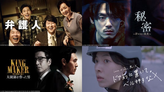 軍事政権下で民主化運動が弾圧されていた1980年代を背景に、国家によって捏造された冤罪事件にひとりで立ち向かった弁護士の実話をもとにしたソン・ガンホ、イム・シワンら豪華キャスト陣がおくるヒューマンドラマ『弁護人』(2016)。ドラマ「哲仁王后~俺がクイーン!?~」(2021)でその名を広めたキム・ジョンヒョンが刑事役を務め、現在の連続殺人事件と10年前に起こった事件が交錯する先の読めない展開で惹きつける『秘密~許せない真実~』(2023)や、演技派俳優として名高いイ・ソンギュンとソル・ギョングがW主演を務め、大統領を目指す男と選挙アドバイザーによる熾烈な大統領選の裏側を描いた実話ベースの社会派映画『キングメーカー 大統領を作った男』(2022)など一度観たら世界観に没入してしまう作品が勢ぞろい。