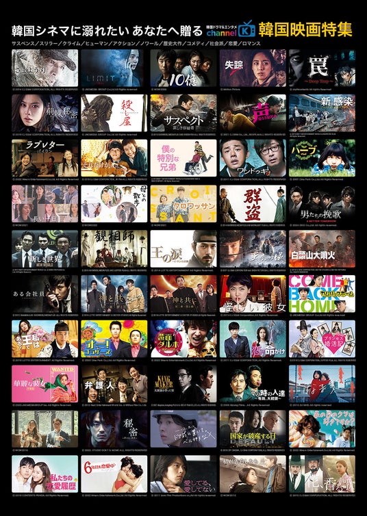 今こそ韓国映画をもっと楽しんでいただきたいという思いからチャンネルKでは、社会派からスリラー、歴史大作、ヒューマンストーリーなど!様々なジャンルや圧巻の脚本力で私たちを魅了してくれる韓国映画に焦点を当て、現在好評配信中、さらには今月中に配信開始予定の作品を含めた50以上の作品を6つのジャンルに分けてご紹介!