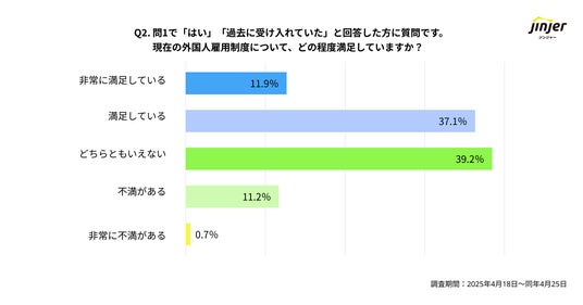 現在の外国人雇用制度に満足しているかについて質問したところ、「非常に満足している」「満足している」を合わせて49%の企業が満足しているという結果になりました。一方で、「不満がある」「非常に不満がある」を合わせて11.9%の企業は不満を感じているようです。
