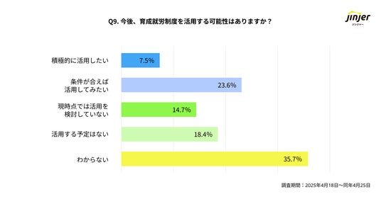 育成就労制度の活用について質問したところ、「積極的に活用したい」「条件が合えば活用してみたい」と回答した企業は合わせて31.1%にのぼりました。一方、「現時点では活用を検討していない」「活用する予定はない」と回答した企業は33.1%と、慎重な姿勢がやや上回る結果となりました。