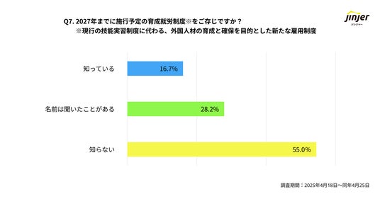 2027年に施行予定の「育成就労制度」についてその認知度について質問したところ、「知っている」と回答した企業は16.7%でした。一方で、「知らない」と回答した企業は55%でした。