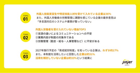 外国人労働者の受け入れに課題感多数で、約33%の企業が制度活用に消極的であることが明らかに
