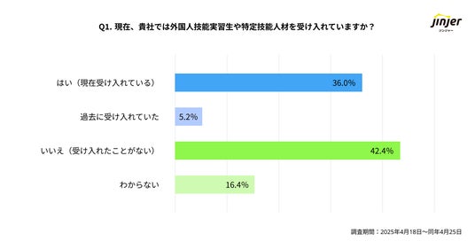 外国人技能実習生や特定技能人材を受け入れているか否かについて質問したところ、「現在受け入れている」と回答した企業は36%でした。次いで「過去に受け入れていた(5.2%)」「受け入れたことがない(42.4%)」という結果でした。
