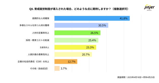 育成就労制度導入後に期待することを質問したところ、「長期的な人材確保(41.8%)」が最多意見でした。次いで「