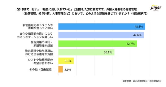外国人労働者の労務管理における課題について質問したところ、最も多い意見は「多言語対応のシステムや書類が整っていない(48.3%)」でした。次いで、「文化や価値観の違いによりコミュニケーションが難しい(47.6%)」「在留資格の確認・期限管理が煩雑(42.7%)」という結果になりました。