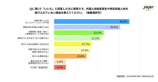 Q1で外国人労働者を受け入れていないと回答した企業を対象に、受け入れていない理由を聞いたところ、最も多くあった意見は「言語の違いによるコミュニケーションへの不安(34%)」でした。次いで「業務内容が制度の対象外である(30.6%)」「労務管理(勤怠・給与・人事管理など)に不安がある(23.1%)」「現時点で人手が足りており必要がない(21.1%)」という結果になりました。