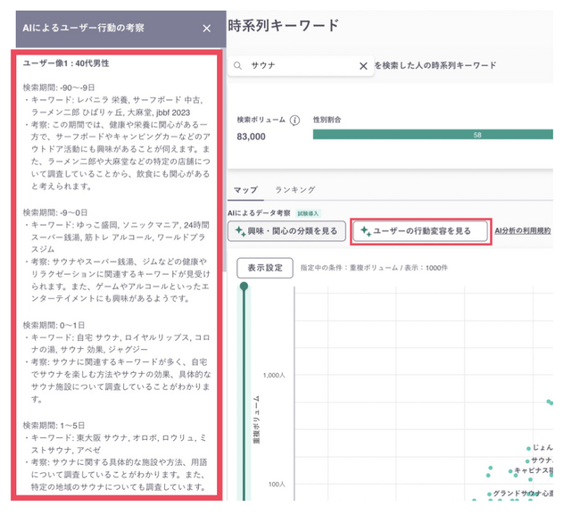 次に、「サウナ」と検索したユーザーの分析の場合、「40代男性」といった人物像が「サウナ」と検索した日を起点として「9日前までアウトドア活動や飲食店について興味を持っている」「9日前から健康やリラクゼーションに関して調べている」「当日から1日後まで、自宅でサウナを楽しむ方法やサウナの効果、具体的な施設について調査している」などの行動の流れを、「検索期間」「キーワード」「考察」としてテキスト形式で出力します。