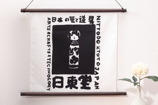 本製品は、お客様から『日東堂』店頭に掲示している林氏デザインの「急須」のポスター(非売品)の販売を望む声を多くいただいたことから、タペストリー棒(別売り)を使えばグラフィックポスターのようにも使える風呂敷として製品化しました。