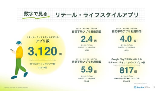 1日におけるリテール・ライフスタイルアプリの平均利用時間は4分でした。※App Apeで2024年3月にMAU500以上を計測したアプリの個数