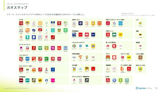 リテール・ライフスタイルアプリのMAUトップ100を主な機能や業種別に24のグループに分類しました。レポート本編では、リリース直後のアプリなど特徴的なアプリをピックアップして紹介しています。ぜひお手にとってご覧ください。