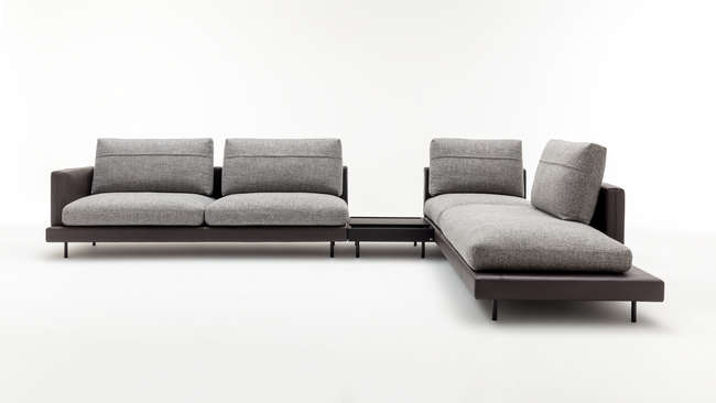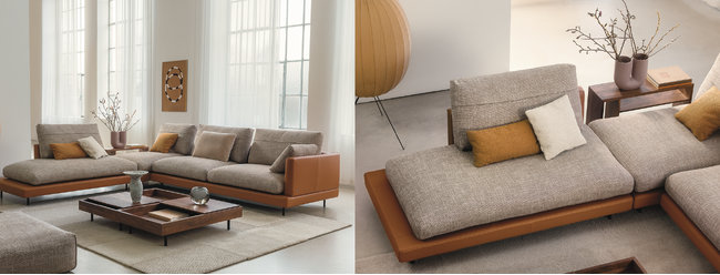 「SINA」はアラビア語で「美」を意味しており、ドイツのクラフツマンシップを随所に感じる精巧なディテールが施されています。最大の魅力は、お好みのパーツを組み合わせ、空間の自由度を高めるモジュール性です。パーツは27種類を取り揃え、ベースのフレームおよびクッションの張地は、ファブリック約200種・レザー約80種と豊富なバリエーションからお選びいただけます。さらに座面の奥行きや高さ、背クッションの仕様、脚部の色などに至るまで、さまざまなオプションがあり、ライフスタイルや様々なシーンにあわせたカスタマイズが可能です。